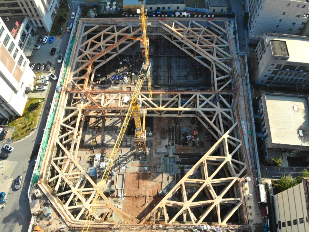 創(chuàng)新采用“旋挖樁+三層混凝土內(nèi)支撐”的復(fù)合支護(hù)體系?;悠矫娉叽邕_(dá)105.2米×81.9米,深度13.3—15.05米,設(shè)置支護(hù)樁279根、鋼立柱54根及三層混凝土內(nèi)支撐。針對(duì)雜填土區(qū)域富含地下水的情況,項(xiàng)目在支護(hù)樁間增設(shè)214根高壓旋噴樁,構(gòu)筑起一道可靠的截水帷幕,有效防止了基坑邊水土流失,保障了基坑穩(wěn)定與周邊建筑物安全。